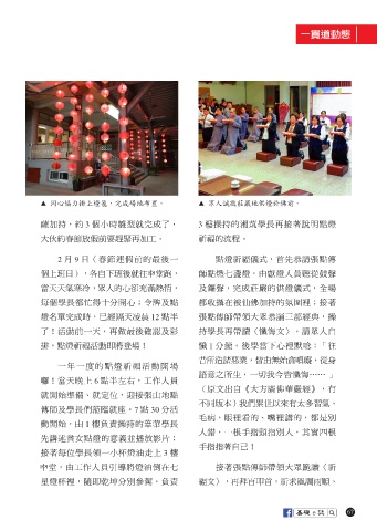 ▲ 同心協力掛上燈籠,完成場地布置。 ▲ 眾人誠敬莊嚴地供燈於佛前。