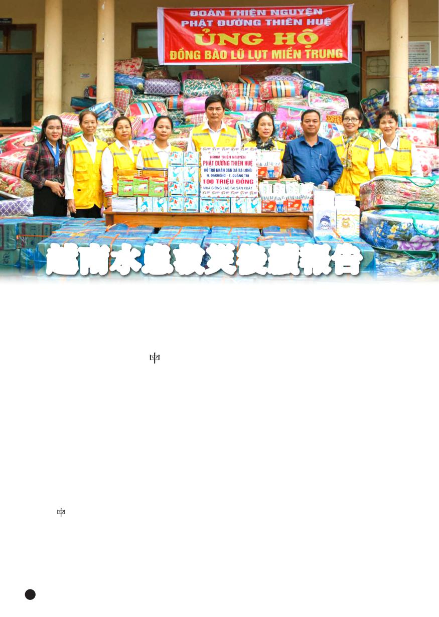 14 NO.385-386 2021.1-2 Về việc báo cáo kết quả chuyến đi thiện nguyện lần thứ 2 đến Miền Trung của Đoàn Phật đường Thiên Huệ. 關於天惠 堂善愿團隊第二次去中部救濟報告 Sau những ngày khảo sát từ tháng 10/2020 kết hợp với thông tin của địa phương xã Ba Lòng, Đakrông, Quảng Trị, đoàn Phật đường Thiên Huệ lại tiếp tục lên đường (lần 2) đi cứu trợ cho nhân dân ở đây như kế hoạch. Chuyến đi bắt đầu từ chiều ngày 5/11/2020 do hai vị nhân viên đi trước để nắm bắt tình hình. 6h00 sáng ngày 6/11/2020 đoàn xuất phát từ Hải Dương, Nhưng vì ảnh hưởng của cơn bão số 10 cho nên khi đoàn vào đến Quảng Trị thì gặp nước lũ dâng cao, đoàn không thể tiếp cận xã Ba Lòng. 2020 10 月開始調查之後,結合廣治省德農區巴隆公社當地的信息,天 堂善愿團隊依照計劃繼續(第二次)向這裡的受難者提供救濟物品。此行從 2020 11 5 日下午開始,由兩位前賢先行以了解情況。 11 6 日上午 6:00 團隊再從海陽出發。然而,由於十號颱風的影響,團隊到達廣治時,洪水氾濫, 無法接近巴隆公社。 瑞周天惠單位提供 越南水患救災後續報告
