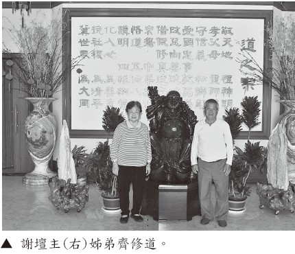 強調「誠心」很要緊,謝壇主和姊姊兩家人就住在對面,每日見面,相互照應,一起修辦道,互相鼓勵扶持,這種骨肉手足情誼,足足延伸七、八十載,真情可見!而謝氏佛堂傳承至今已經三代同堂、齊家修道,兒子平日會開車載送道親開班研究,孫子也已經上大學了。