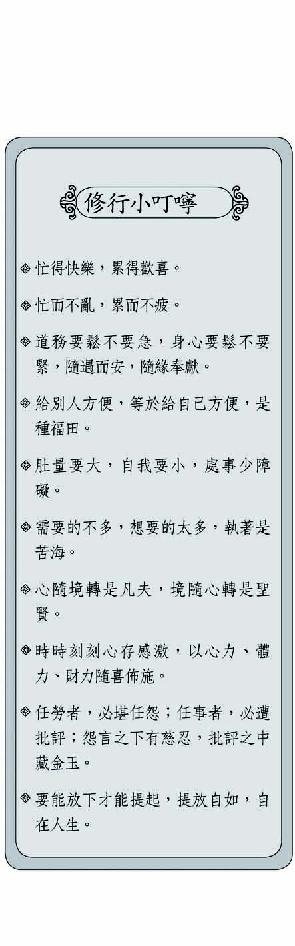 pg_0001 修行小叮嚀(1)/本社資料室 忙得快樂,累得歡喜。 忙而不亂,累而不疲。 道務要鬆不要急,身心要鬆不要緊,隨遇而安,隨緣奉獻。 給別人方便,等於給自己方便,是種福 田。 肚量要大,自我要小,處事少障礙。 需要的不多,想要的太多,執著是苦海。 心隨境轉是凡夫,境隨心轉是聖賢。 時時刻刻心存感激,以心力、體力、財 力隨喜佈施。 任勞者,必堪任怨;任事者,必遭批評 ;怨言之下有慈忍,批評之中藏金玉。 要能放下才能提起,提放自如,自在人 生。