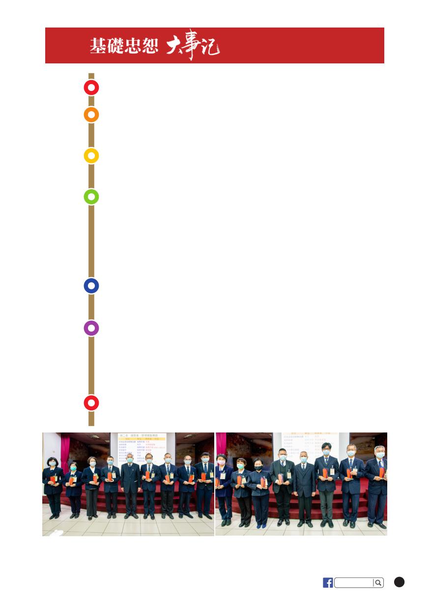 2020 11 16 日至 12 20 日) 69 基礎 e 誌 11/17 12/19 11/28 11/21 12/05 12/12 12/13 基礎忠恕道院社福處召開會議,共有點傳師與職志工13位參與。 基礎忠恕青年大會師幹部成長營中南部場假台中光輝道院舉辦, 共有點傳師、籌備幹部、服務人員,以及各單位青年270位參與。 基礎忠恕青年大會師幹部成長營北部場於基礎忠恕道院舉辦, 共有點傳師、籌備幹部、服務人員,以及各單位青年480位參與。 基礎忠恕人才智庫菁英研習論壇於基礎忠恕道院舉辦,共有點 傳師、各單位歷任和現任道務助理、心靈成長班及新制初級部 講師、碩博士道親等超過 380 位參加。 瑞周天曉單位今起兩天假基礎忠恕道院舉辦壇辦法會,共有點 傳師、壇辦人員 250 位參加,並自由參觀文物館。 師尊、師母同領天命 90 週年感恩紀念大會動唱表演人員假忠恕 道院進行團練,共有點傳師、各單位表演人員 370 位參與。 基礎忠恕學院舉辦初、中、高級部聯合結業典禮,共有各分部 點傳師、結業生及學員 615 位參加。 老前人成道十週年暨袁前人成道五週年感恩追思大會佈局活動 於點傳師班舉行頒獎典禮。 瑞周天惠單位高雄禮儀班李邦雄、蔡清東兩位點傳師率班員共 35 位參訪忠恕道院。 老前人成道十週年暨袁前人成道五週年感恩追思大會各佈局活動第二名(左)、第三名(右) 獲獎者。